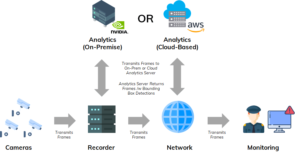 Analytics can be deployed with NVRs, but usually require the analytics provider to build an API integration with the NVR manufacturer to enable streaming of camera feeds to either an on-premise or cloud-based GPU server.